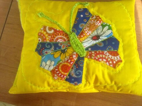 Смешанное шитье аплликация и печворк. Прекрасные бабочки могут порхать по одеялу или пледу, присядут на диванных подушках. Делаю трафарет чтобы выкроить крылышки бабочки. Круг разделяю на мелкие сектора. Вершину сектора можно сделать закругленной, а можно заостренной. По центру круга еще одна маленькая окружность. Выкраиваю несколько секторов. Я хочу сшить крыло бабочки из пяти секторов. Выкраиваю из цветных тканей по пять секторов для каждого крыла. Припуски на шов равны 0,7 см. Сшиваю сектора между собой. Швы разутюживаю. Затем в каждый сектор вставляю картонные трафареты и заутюживаю припуски швов на изнаночную сторону. Прикалываю крылышки булавками к фону. И пришиваю вручную по краю крылышек. Тельце бабочки можно сделать из шнура или пряжи, я связала крючком цепочку. И небольшую полоску для центра тельца. Пришиваю цепочку, делаю усики и вшиваю центр тельца. Бабочка готова. Все готовлю для стежки. Подкладка, синтепон, панно с бабочкой. Все слои скал