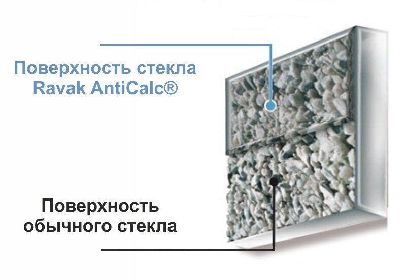 С помощью технологии RAVAK AntiCalc® на стекле образуется водоотталкивающий слой, который не дает каплям воды на нем удержаться, поэтому они стекают вниз. Небольшие капли, которым удалось задержаться на стекле, хоть и оставляют после себя высохший осадок, но он не имеет химической связи с поверхностью стекла, и поэтому такие следы очень легко удаляются протиранием загрязнëнных мест тряпочкой.
