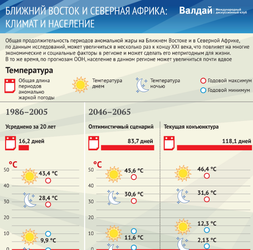 По данным исследователей изменений климата из Института химии Общества Макса Планка (Германия) и Университета Никозии (Кипр), высший и нижний предел температур в регионе Ближнего Востока и Северной Африки поднимется на всего несколько градусов. Однако общая длина периодов аномальной жары увеличится в несколько раз, с 16 до 84 (если изменение климата замедлится) или 118 (при текущей конъюнктуре) дней в году. В то же время, по прогнозам ООН, население в данном регионе может увеличиться почти вдвое. Подробнее о вопросах климата и населения - в инфографике Валдайского клуба.