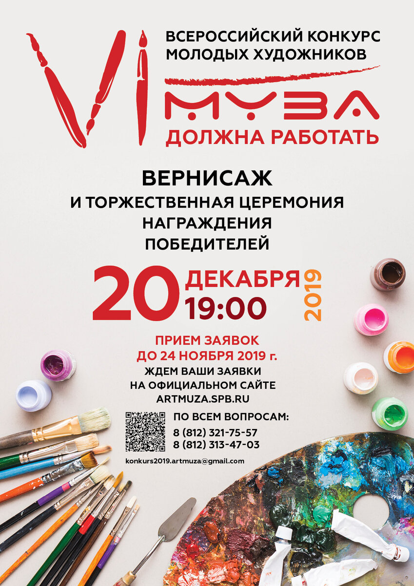 Музей современного искусства АРТМУЗА объявляет старт VI Всероссийского Конкурса молодых художников «Муза должна работать». Авторитетный Всероссийский Конкурс «Муза должна работать» призван помочь молодым художникам заявить о себе и реализовать свой творческий потенциал. Победителям Конкурса будет представлена уникальная возможность продвижения на арт-рынке посредством организации персональной выставки в Музее современного искусства АРТМУЗА. Возрастная категория участников конкурса: от 20 до 40 лет. ЭТАПЫ КОНКУРСА: 1-й этап: · - 20.09.19 – 24.11.19 – прием заявок на участие в Конкурсе. 2-й этап: · -26.11.19 – 29.11.19 – отбор участников, выявление лучших работ. Перед компетентным жюри встанет задача – определить пятьдесят лучших. · - 30.11.19г. – объявление имен участников Всероссийского Конкурса; · - 02.12.19 – 15.12.19 – предоставление оригиналов работ; · - 20.12.19 в 19:00 – торжественное открытие и награждение участников. · - 20.12.2019г. – 30.01.2020г. – выставка работ-поб