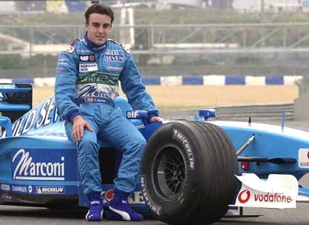 В сезоне 2002 года Фернандо не проводил гонок в Формуле-1, занимая позицию запасного пилота в «Рено», при Ярно Трулли и Дженсоне Баттоне. В скорости испанца Бриаторе уже не сомневался, и на следующий год он был переведён в основной состав на место ушедшего в BAR Баттона. Алонсо с самого начала показал, что не будет играть вторую роль в команде: он завоевал поул-позишн в Малайзии, был вторым на домашней гонке, а в Будапеште одержал свою первую победу. Кроме того, его классифицировали третьим в Бразилии, однако тот подиум носил оттенок курьёза — гонка проходила в дождь, и после аварии на 55-м круге Марка Уэббера на трассу уже была выпущена машина безопасности, но Алонсо не снизил скорость, и на полном ходу врезался в покрышку от разбитой машины Марка. Машина Фернандо ударилась в отбойник, отлетела в противоположную стену, а обломки буквально усыпали трассу. Гонку пришлось остановить, и на этот момент Алонсо оказался третьим. Впрочем, на подиуме Фернандо не оказалось — он был отправлен в больницу с лёгким сотрясением мозга. После финиша фактический хозяин Формулы-1, Берни Экклстоун, выразил своё негодование по поводу поведения испанца. Но впоследствии у Алонсо было много ярких гонок, Берни сменил гнев на милость, а по итогам сезона Алонсо стал шестым и уверенно опередил своего партнёра, опытного Ярно Трулли.