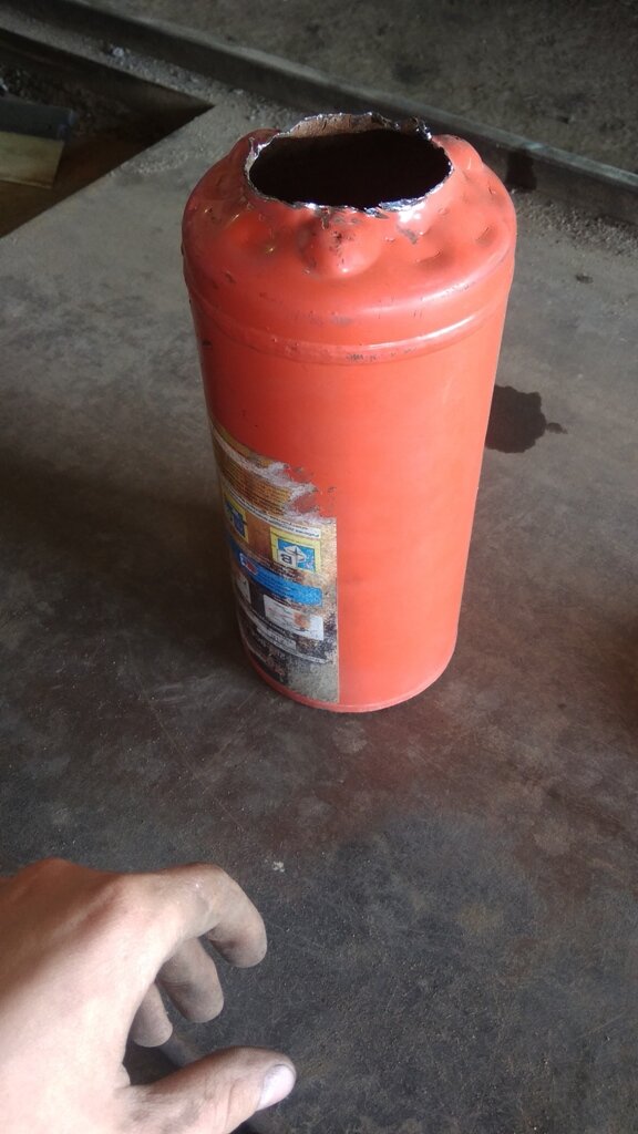 Произошел казус с личной машиной одного сварщика, освободился огнетушитель, точнее, опустошился. Вскоре был вымыт и пущен на эксперименты. Для начала надо вскрыть глушитель и прорезать в крышках круглые отверстия. Прямоточный глушитель - весьма серьезный и достаточно сложный элемент, который вот так на коленке не получится сделать. Это в теории. На практике же, все гораздо проще. Берем старый огнетушитель и отрезаем от него верхушку, точно по шву. Можно, конечно, и по центру, но так удобнее. Следом надо подобрать трубу по диаметру выхлопной трассы. В ней можно насверлить отверстий, а можно нарезать, ведь колхоз - цель нашего действа. Далее берем болгарку с маленьким диском, чтобы можно было вырезать отверстие под трубу в обеих крышках. Помним, что когда режем отверстия в трубе, важно, чтобы они не выходили за пределы банки. Следующий шаг - вставляем трубу в банке и провариваем. После это трамбуем внутрь минеральную вату. Она не горит, так что должна какое-то время поработать. Ну