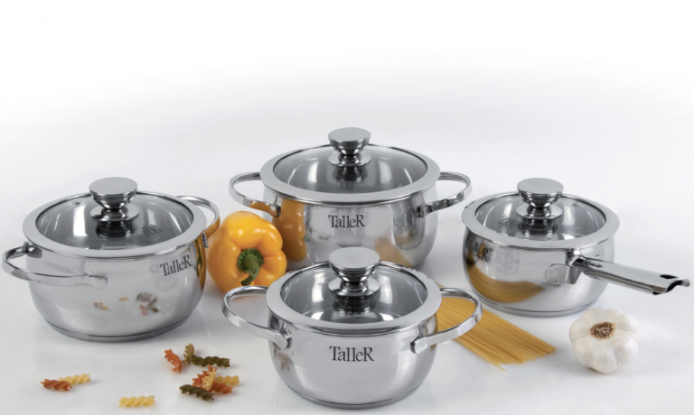 Посуда Taller – это современное качество по доступной стоимости изделия. Продукция характеризуется следующими особенностями: Также производитель выпускает посуду со съемными ручками, которые могут использоваться в духовом шкафу. Покрытие и дно Дно изделия имеет трехслойную структуру (нержавейка-алюминий-нержавейка). В среднем толщина дна составляет 2,7 мм, но может достигать и более 5 мм, а толщина теплораспределительной прослойки 1,6 мм, а может варьировать от 0,3 мм и более. В данном случае все зависит от модельного ряда посуды. Также в днище посуды расположена капсула из алюминия, которая обеспечивает равномерное распределение тепла. Технологический процесс изготовления продукции по тиру пайки, что заметно по виднеющимся пустотам внутренней капсулы днища. Внешний слой наделен магнитными характеристиками, что позволяет эксплуатировать кастрюлю на индукционной плите. Материалы изготовления кастрюль На сегодняшний день производитель выпускает продукцию из нержавеющей стали AISI 304