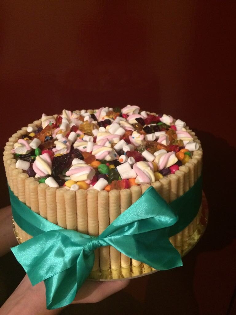 Я хочу вам предложить простой рецепт бисквитного торта с фруктовой начинкой и украшением из сладостей. Для самого бисквита нам понадобится 5 яиц, стакан сахара, стакан муки и ванилин по вкусу. Взбиваем яйца с сахаром, добавляем ванилин, либо ванильный сахар, масса должна увеличиться примерно раза в три-четыре, затем добавим муку, все быстро перемешаем (чтобы тесто не осело). Предварительно сковороду нужно смазать сливочным маслом и посыпать немного мукой. После того, как тесто готово, перекладываем его в сковороду, ставим в духовку примерно минут на 30-40 (лично я, готовность проверяю зубочисткой или деревянной шпажкой). В первые 10-15 минут, дверцу духовки открывать нельзя, т. к. тесто осядет. Когда коржи будут готовы, вытаскиваем и даем им остыть. А пока делаем крем. Для простого бисквитного торта, без заморочек), я делаю масленый крем. Взбиваю сливочное масло со сгущенным молоком, пробую по вкусу. Когда коржи остынут, разрезаю их, пропитываю либо сладким сиропом, либо соком (наприм