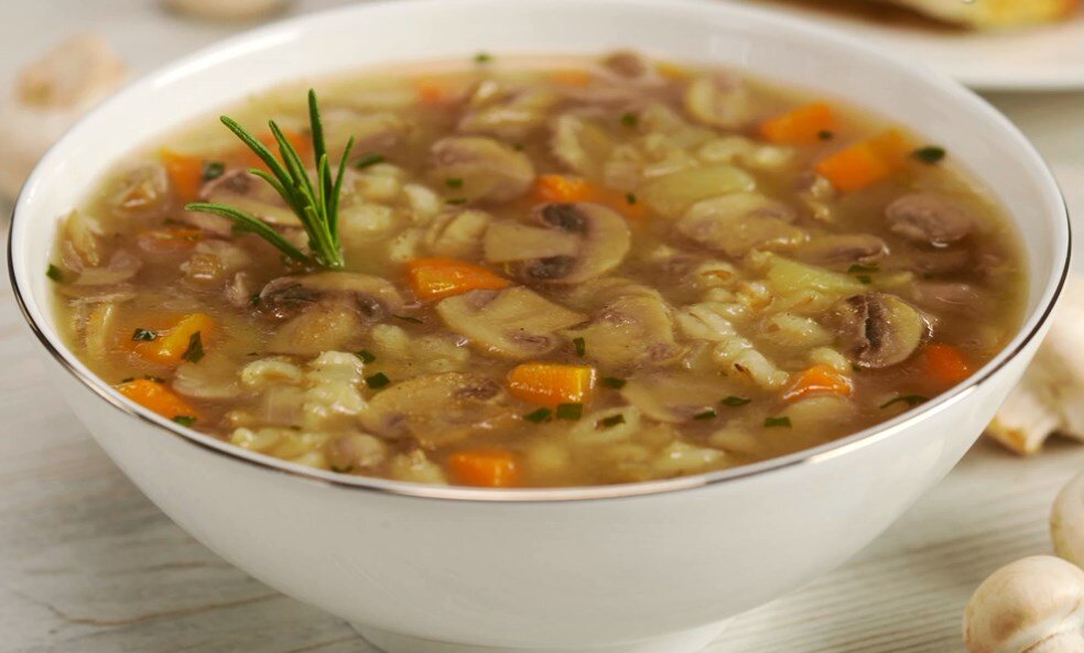 Добрый день! Грибной суп – это всегда вкусно, однако даже его можно сделать ещё вкуснее! Суп, приготовленный по этому рецепту, станет наваристым, ароматным и сытным. Для этого нужно добавить в него перловку, сочетание которой с грибами придает супу особый вкус. Ингредиенты: - шампиньоны или лесные грибы - 600 гр.; - лук репчатый - 200 гр.; - картофель - 400 гр.; - морковь - 150 гр.; - перловая крупа - 100 гр.; - лавровый лист - 3 шт.; - розмарин свежий - 1 веточка или сухой 1 ч.л.; - овощной бульон или вода - 1,8 л.; - оливковое масло - 2 ст.л.; - мука пшеничная - 2 ст.л.; - холодная вода 3 ст.л.; - соль - 1 ст.л. - перец чёрный молотый - 1/2 ч.л. В кастрюлю наливаем 2 столовых ложки оливкового масла. Отправляем нарезанный лук, и немного обжариваем на среднем огне. Добавляем грибы, и периодически перемешивая их с луком, обжариваем 5 минут на сильном огне. Нарезанную кубиками морковь выкладываем в кастрюлю. Добавляем 100 гр. перловой крупы и 400 гр. нарезанного кубиками картофеля. Насып