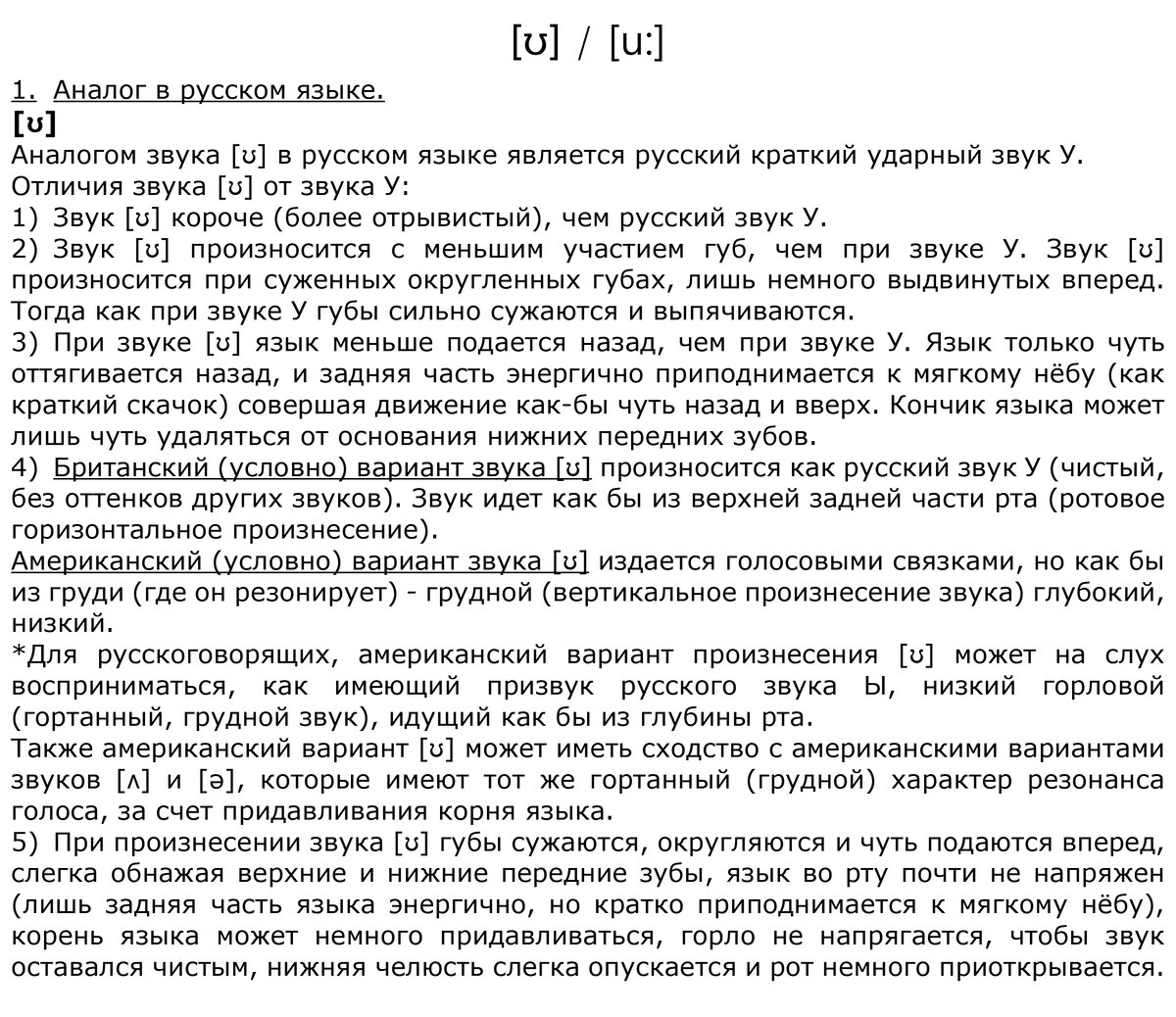 [ʊ] - как У, но менее задний и менее огубленный / [u:] - как чистый У и как Ю, с подъемом средней части языка, трижды переменный