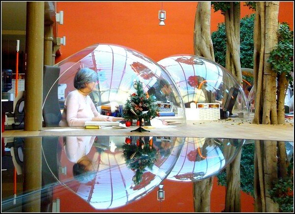100 лет назад воображение русского писателя Евгения Замятина создало мир будущего, где люди живут в домах со стеклянными стенами. Веком позже французские архитекторы из бюро Christian Pottgiesser спроектировали офис для компаний Pons и Huot, в котором сотрудники работают в индивидуальных стеклянных куполах. Знаете, в чем разница между книгой и реальностью?.. В романе-антиутопии Замятина "Мы" прозрачные стены олицетворяли тотальный контроль государства над личностью. А стеклянные полусферы в современном французском офисе призваны наделить каждого сотрудника своим собственным пространством. Пусть и со всех сторон просматриваемым, но все-таки - индивидуальным. Необычный офис занимает 540 м2 в бывшем промышленном здании конца XIX века, автором которого предположительно является знаменитый Густав Эйфель. Работают здесь всего 15 человек. У 8 из них (руководителей) есть свои отдельные кабинеты, а 7 подчиненных трудятся за большим общим столом в атриуме. Над каждым рабочим местом установле