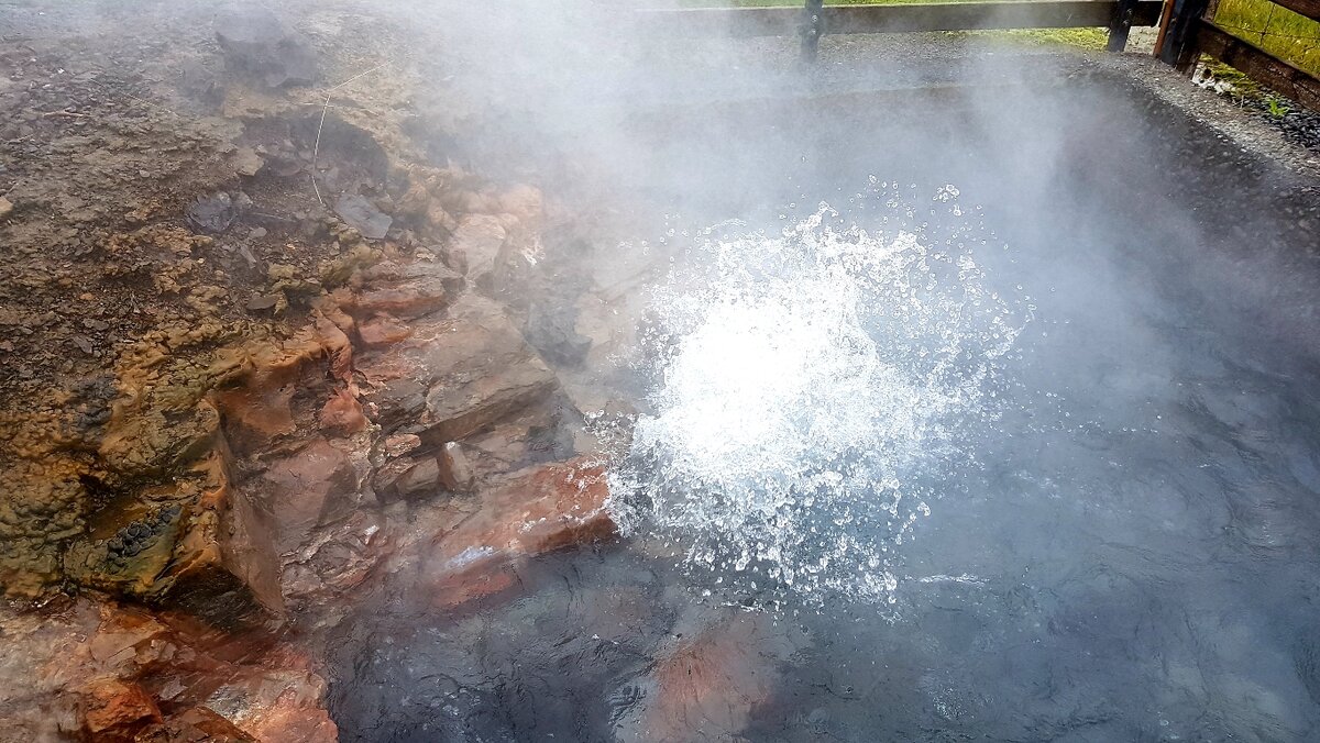 Самая широкая "кипящая" река мира - Дейдартунгувер (Deildatunguhver) расположена в прекрасной стране Исландия, к северу от ее столицы - Рейкьявика, в 100 километрах, рядом с дорогой № 50. Расход воды в этих каскадах кипятка, бьющих из горячих ключей, составляет 225 л. в секунду. Зрелище уникальное. Вот представьте, вы поставили кастрюлю на плиту, и через несколько минут вода в ней закипела. Вот тут – то же самое. Ощущение, что под рекой огромная электрическая плита, которая разогрела воду, до температуры 100 градусов и она кипит, но не выкипает окончательно. Везде пар, тепло и бульканье. Ну, точно так же, как в детстве, когда каждый из нас забывал на конфорке кастрюлю с кипящими макарошками. Несмотря на то, что на улице было промозгло и достаточно холодно, искупаться в этой чудо-реке мы не рискнули. Хотя ее тепло очень манило нас. Даже в парах от процесса кипения очень тепло и необычно. Ощущаешь себя ёжиком в тумане. ОКРЕСТНОСТИ РЕЙКЬЯВИКА, ЧТО ТУТ ЕСТЬ ЕЩЕ Вообще рядом с Рейкьявико