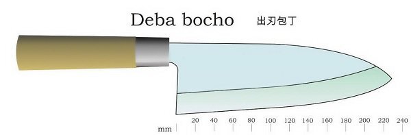 - Обычная длина клинка Deba достигает 240 мм, хотя встречаются экземпляры от 150 мм до 300 мм.