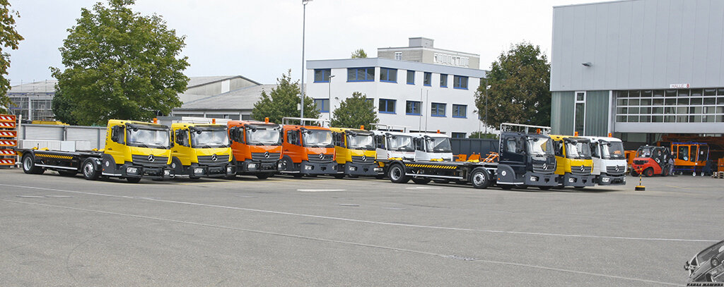 На самом деле, никакие это не «Мерседесы»: это специальные терминальные тягачи Wiesel, выпускаемые фирмой KAMAG с использованием кабины от грузовика Mercedes-Benz Atego. Просто так встретить на улице эти машины невозможно: они используются в логистических терминалах для быстрого перемещения полуприцепов или съемных кузовов со стоянки под погрузку/разгрузку и обратно. И вся конструкция машины полностью подчинена тому, чтобы водитель мог делать эти операции предельно быстро, ни на секунду не выходя из кабины. Вот так выглядят новенькие «Визели» на площадке готовой продукции: