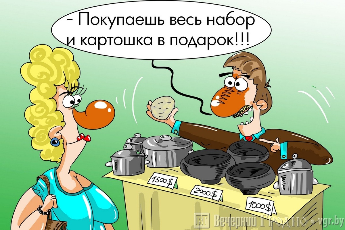 — Стоимость этого комплекта, — сразу говорю, не пугайтесь, — 6190 белорусских рублей. У нас есть два способа приобретения, и в каждом посуду забираете уже сегодня! Наличные сразу, или банковская рассрочка на 24 месяца, или кредит на 36 месяцев — переплата всего 8 процентов. Если брать в кредит на три года, в месяц выходит примерно 180 рублей.