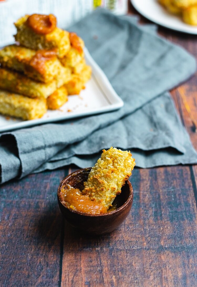 2. Окунуть каждый ломтик тофу в смесь из крахмала и воды и затем обвалять в крошках. Выложить на аэрогриль, взбрызнуть тофу маслом и готовить 15 минут при температуре 180 градусов, перевернув в середине процесса приготовления.