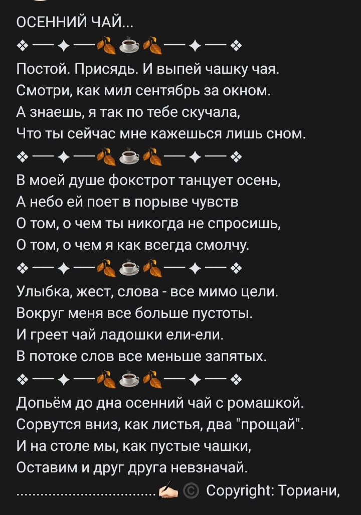 Современная поэзия, с уст молодых талантов) Осенний чай, кто не любит в холодный осенний день, посидеть дома укутавшись, и с кружечкой горячего чая)))) Данное произведение, сравнивает отношения, с осенью... А расставание, как окончание лета. Это моя интерпретация, у вас могут возникнуть свои мысли по этому поводу. Продолжаем) Здесь все просто, описание и пожелания к жизни, слились в паре четверостиший... А ведь автор в чем-то прав) И последнее на сегодня, но не окончательное, ибо творчество всегда будет) Сразу поблагодарим Викторию Есину, за столь замечательное произведение) Здесь слова лишние, и автор все нам дал понять) Спасибо за ваше внимание, ждём ваших пожеланий, комментарий, а так же подписок)