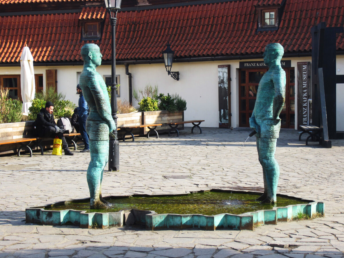 Если были в Праге, то не удивлю. У меня всё началось с “писающих мальчиков”, продолжилось неоднозначным памятником известному философу и завершилось жёлтыми переработанными пингвинами. Коллега до сих пор припоминает мне тот трип. Говорит, что перевёрнутый конь Вацлава всё ещё является в страшных снах. Смотрите подборку - может и вам явится. 1 место: Писающие мужчины (Давид Черны) Первое, что попалось на глаза и вдохновило поискать другие. Если коротко: два мужика писают в ёмкость, напоминающую контуры Чехии. Отправьте смску и ваш текст выписают. Я не пробовала, но вот номер: +420 724 370 770 Ещё можно монетки кинуть и загадать желание. Правда их подберёт бомж, дежурящий неподалёку. Ну а как вы хотели. Адрес: Cihelná 2, Praha 1 2 место: Перевёрнутый конь или Св.Вацлав на перевёрнутом коне (Давид Черны) Альтер-эго памятника Св. Вацлаву, который на Вацлавской площади. Как оказалось, конь изображён мёртвым и должен был приветствовать всех посетителей Главпочтампа, но не сложилось. И тепе