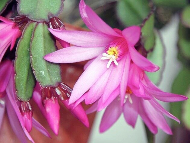 Я вот, например, первый раз слышу и вижу такую красоту! И была очень удивлена, когда узнала, что это кактус с красивыми ярко-розовыми цветками. На самом деле я не особа люблю кактусы и мой кот невзлюбил все время их скидывал с подоконника и носом собирал все иголки. Сколько раз пыталась их полюбить и все никак. Но в этот кактус я влюблена, скажите какой же он красивый, не правда ли?! А знаете какое у него второе название? Это пасхальный кактус, потому что он цветет весной прям на Пасху. Чтобы он вовремя зацвел, необходимо держать целый год температуру выше 10 °C, а ранней весной обильно поливать и подкармливать. После цветения следует обеспечить менее обильный полив и дать растению отдохнуть. В хороших условиях кактус достигает высоту 30 см, вовремя цветения желательно цветок не перемещать чтобы бутоны не опали. Уход за растением, что необходимо?