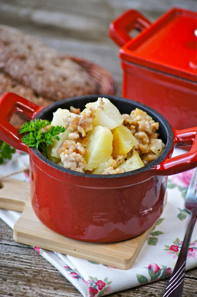 Не знаю, кто как, а я очень люблю еду в горшочках, это же так вкусно и аппетитно. На днях готовила мужу эту вкуснятину, он попросил запечь картошку с мясом, а у меня был только куриный фарш. Это совсем не расстроило, блюдо получилось вкусное, сытное и ароматное. Ингредиенты Картофель - 800 г Фарш мясной - 400 г Майонез - 3 ст.л. Лук репчатый - 1 шт. Соль и специи - по вкусу Все готово, подавать это блюдо нужно в горячем виде со свежей зеленью или овощами. Приятного аппетита! Можете посмотреть пошаговый рецепт тут или видео версию, ей я делилась тут