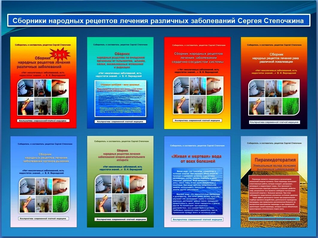 Меня зовут Сергей Степочкин. Я собиратель и составитель народных рецептов лечения различных заболеваний. В 1991 году был комиссован из войск по состоянию здоровья по 2 группе инвалидности. По 5 - 6 раз в году лечился в госпиталях. Мой настоящий диагноз нашли только спустя 2 года после заболевания. А эти 2 года меня лечили от всего. Таблетки я принимал горстями, но они не приносили должного улучшения здоровья. У меня в организме произошли необратимые процессы, и моя болезнь считается неизлечимой. Так что, про боль и безысходность я знаю не понаслышке, и могу понять и прочувствовать чужую боль. С 80-х годов прошлого столетия я собираю старинные и современные, народные и знахарские рецепты лечения различных заболеваний. С 2007 составляю сборники народных рецептов лечения. В 2015 г. я издал свои первые шесть сборников в издательстве. Там они представлены, как в книжном, так и в электронном вариантах. Народные рецепты, представленные в моих сборниках, действенны и эффективны, но главное