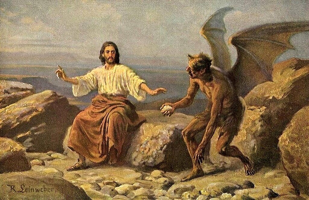 «Тогда Иисус возведен был Духом в пустыню, для искушения от диавола, и, постившись сорок дней и сорок ночей, напоследок взалкал. И приступил к Нему искуситель и сказал: если Ты Сын Божий, скажи, чтобы камни сии сделались хлебами. Он же сказал ему в ответ: написано: не хлебом одним будет жить человек, но всяким словом, исходящим из уст Божиих. Потом берет Его диавол в святой город и поставляет Его на крыле храма, и говорит Ему: если Ты Сын Божий, бросься вниз, ибо написано: Ангелам Своим заповедает о Тебе, и на руках понесут Тебя, да не преткнешься о камень ногою Твоею. Иисус сказал ему: написано также: не искушай Господа Бога твоего. Опять берет Его диавол на весьма высокую гору и показывает Ему все царства мира и славу их, и говорит Ему: все это дам Тебе, если, пав, поклонишься мне. Тогда Иисус говорит ему: отойди от Меня, сатана, ибо написано: Господу Богу твоему поклоняйся и Ему одному служи».
