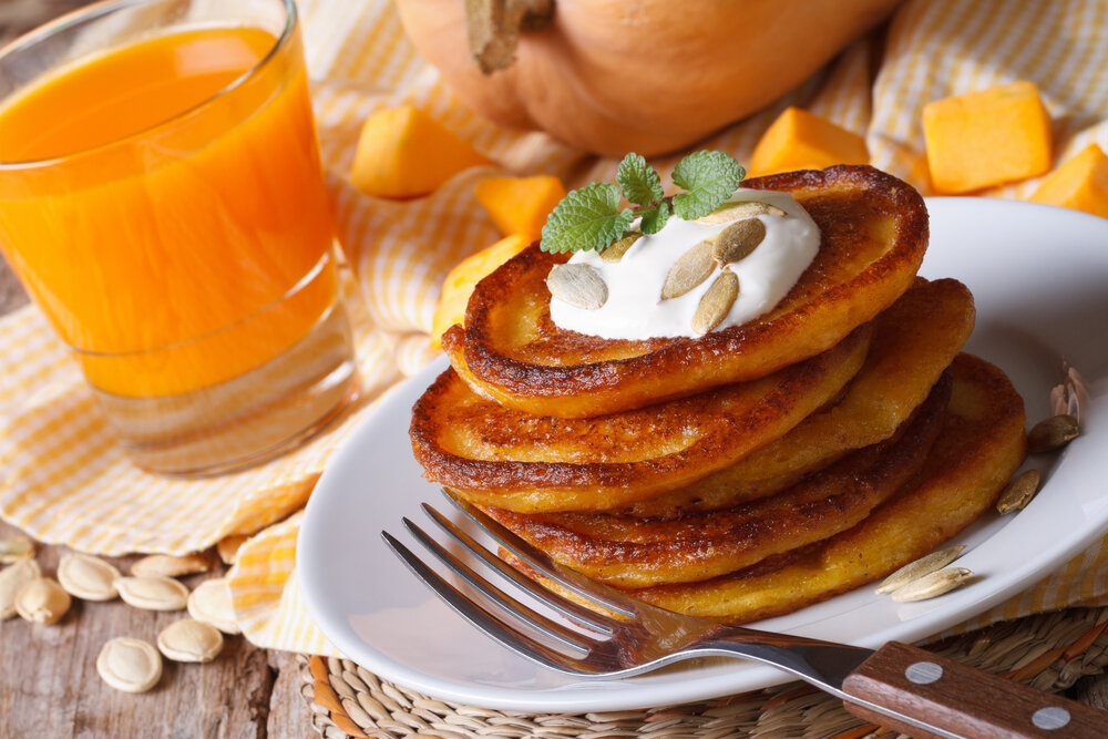 Оладьи из тыквы — замечательный осенний завтрак.В нашем рецепте тесто слегка приправлено специями, но если вы любите пряный вкус, его можно усилить парой щепоток молотого имбиря. Тесто можно делать на обычной муке и на более полезной — цельнозерновой. Последнюю можно смело выбирать, если вы решите использовать имбирь, он перекроет ее специфический, не всеми любимый вкус. Однако следует помнить, как ни крути, из цельнозерновой муки оладьи не получатся воздушными, тесто будет плотным. Тыквенное пюре быстро можно сделать, отварив тыкву, порезав мелкими кусочками и потом измельчив блендером, но вкуснее получается, если готовить его из запеченной тыквы. Это займет у вас чуть больше времени, но оно того стоит. Разрежьте небольшую тыкву на две половинки, вычистите семена и вот так, перевернув срезом вниз, запеките в духовке до мягкости. Пюре можно заготовить много - оно прекрасно храниться в банках в холодильнике, а использовать его можно для самых разных нужд: не только для оладьев, на ег