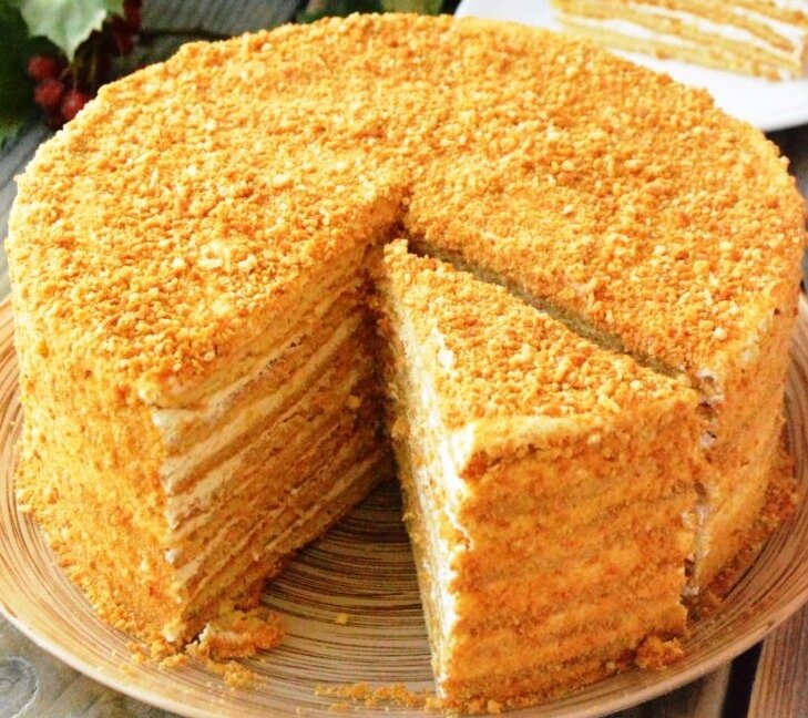 Готовить его муторно и не так-то просто, но зато получается настоящий медовый торт из настоящих продуктов, а не магазинный продукт промышленной химии с бесконечным сроком годности. Для коржей нам понадобиться: 1. 2-а яйца. 2. 1-ин стакан сахара 3. 2-е столовые ложки настоящего густого меда, купленного у проверенного пасечника, а не в магазине. 4. 100 гр. сливочного масла максимальной жирности. 5. 2-е чайные ложки пищевой соды и уксус 9% для гашения. 6. 3,5-ой стакана муки. Взбиваем яйца с сахаром до белого цвета. Добавляем не перемешивая мед, масло, соду, погашенную уксусом и ставим на баню (блюдо с тестом ставим на кастрюлю с кипящей водой). Постоянно помешивая до тех пор, пока все не растворится до состояния однородной массы. Охлаждаем естественным образом до комнатной температуры. Постепенно по одному стакану добавляем муку и замешиваем до густоты как на пельмени. Разделяем тесто на 6-8-м одинаковых кусков, придаем им форму круглых булочек и отправляем на 20-25 минут в холоди