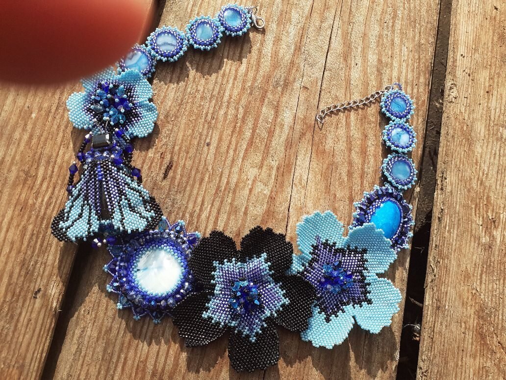 В последние годы дизайнеры всего мира очень много внимания уделяют украшениям из бисера, бисер по праву занял своё место в мире моды. Времена когда бисер считался чем то дешевеньким и непритязательно давно минули. Производство ювелирного бисера стало целой индустрией. Преуспели на этом поприще пока только трудяги японцы . Теперь трудно повстречать модельера который бы не использовал в свих работах по настоящему шикарный бисер японских производителей. Вот одна из моих последних работ, колье из мельчайшего бисера ТОХО №15 бисеринки по размеру примерно как манная крупа, на фото это вряд ли будет понятно, но благодаря их мизерному весу, колье несмотря на свой объём очень лёгкое, весит примерно 30 грамм. Колье уже у своей хозяюшки от которой я получила фотоотчёт на скорую руку!) Фото опубликовано с разрешения Ирины конечно же. Серьги сделала ей в подарок)) Размер колье регулируется, можно и под шейку носить и чуть ниже опускать.