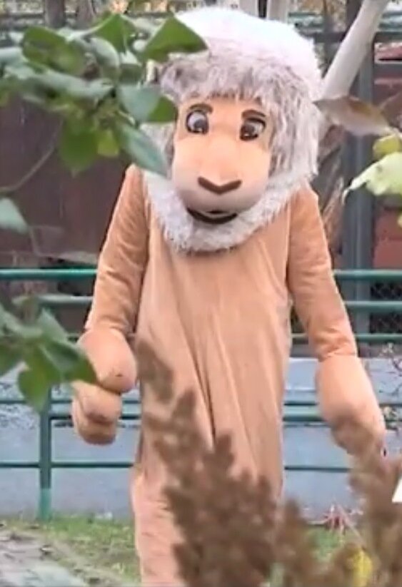 Человек в костюме льва похож на уставшего аниматора, бредущего после работы домой. На самом же деле сотрудник парка исполняет роль опасного хищника, который выбрался из клетки в зоопарке Красноярска «Роев ручей».