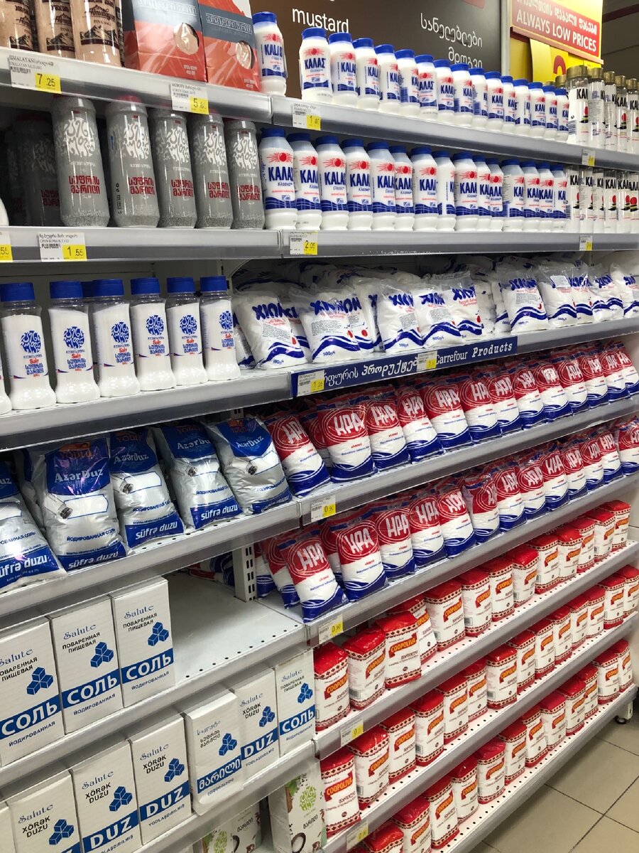 Хотя в Батуми много магазинов формата «у дома» и местные жители часто закупаются там, мы чаще всего посещаем сетевые магазины, такие как Spar, Goodwill. Для массовых покупок предпочитаем Carrefour, там дешевле и ассортимент больше. Смотрите только сколько соли: