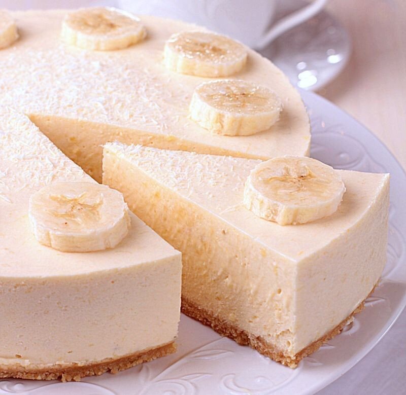 Для основы пирога необходимо: 50 г масла коровьего; 300 г печенья овсяного; две больших ложки молока. Чтобы приготовить крем нужно: три банана; цедра апельсина или лимона одна ложка (маленькая); сок лимонный три больших ложки; сахар ванильный, одна большая ложка; сливки один стакан; 3 больших ложки мёда; 2 больших ложки пудры сахарной; пол стакана сметаны; 300 граммов творога. Банановый чизкейк без выпечки готовится следующим образом: На дно формы постелить пергамент. Печенье следует растолочь, насыпать в форму, смешать с маслом, молоком. Поместить в холодильный шкаф. Растереть бананы. Насыпать желатин в сок лимона, подержать 15 минут на водяной бане, смешать с растёртыми бананами, поместить в холодильник. Сахар, сметану, творог, мед и сахар ванильный следует перемешать. Выложить в форму и подержать на холоде. Банановый чизкейк без выпечки готовится следующим образом: На дно формы постелить пергамент. Печенье следует растолочь, насыпать в форму, смешать с маслом, молок