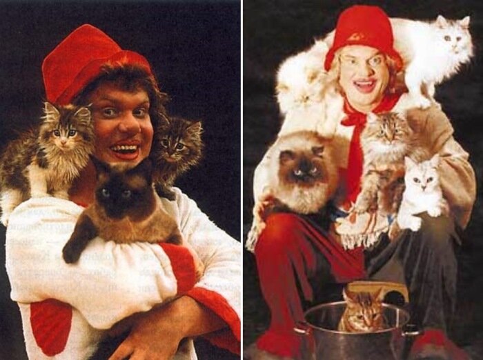 В 1976 году об клоуне Юрии Куклачёве узнала вся страна. У артиста была кошка Стрелка, которая любила спать, свернувшись клубочком в кастрюле. Почему бы не сделать с ней номер? "Кот и повар", а затем и другие номера прославили артиста.