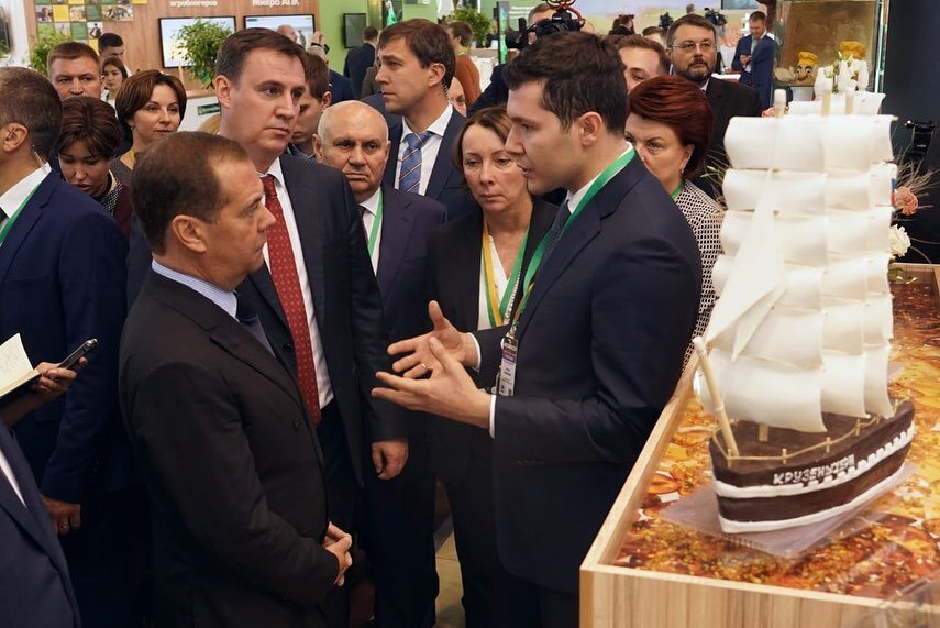 В Москве сегодня, 9 октября, губернатор Калининградской области Антон Алиханов встретился с премьер-министром России Дмитрием Медведевым. Это произошло на агропромышленной выставке «Золотая Осень», где Алиханов рассказал Медведеву о достижениях аграриев из самого западного региона страны в части производства продовольствия. По словам Алиханова, Калининград занял второе место по урожайности зерновых и зернобобовых культур — 50,8 ц/га, и первое место по урожайности рапса — 32,1 ц/га, третье место по среднему надою на одну корову в сутки — 22,6 кг. «Просили Председателя Правительства поддержать проект реконструкции калининградского морского канала для наращивания наших возможностей в экспортных поставках продовольствия. Рассказали о новых маломерных судах для прибрежного лова, которые спроектированы и строятся в Калининградской области. Считаем необходимым распространить на эти типы судов меры поддержки из федерального бюджета», — сообщил Алиханов в своём Инстаграме. Одновременно губернат