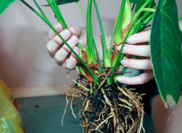 Пересадка антуриума в домашних условиях производится только в случае крайней необходимости из-за большой хрупкости листьев и корней. Это делается в основном для размножения, а также при слишком тесных горшках, как правило, один раз в три-четыре года. Интересные статьи: Болезни антуриума и их лечение, а так же что делать, если антуриум не цветет При этом в случае обнаружения выходящих из дренажных отверстий горшков корней, пересадка производится в обязательном порядке, так как это может привести к образованию загнивания корней. То же самое нужно сделать и при появлении белого налета на поверхности почвы, так как это говорит о сильном истощении субстрата. Пересадка и размножение антуриума, как и многих растений, происходит в период активного роста (февраль-август). Ежегодно пересаживаются только молодые растения. Готовим грунт для пересадки антуриума Почву для антуриума можно приготовить самостоятельно. Для этого нужно взять лиственную лесную землю (две части), болотный мох и дерновую з
