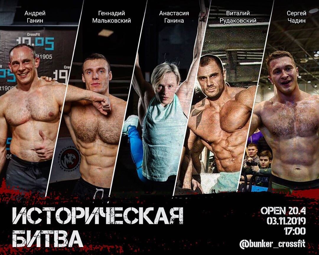 3 ноября на площадке московского клуба Bunker D-6 ведущие кроссфит-атлеты нашей страны будут соревноваться в выполнении четвертого комплекса CrossFit Open 20.4. Андрей Ганин, Геннадий Мальковский, Анастасия Ганина, Сергей Чадин и Виталий Рудаковский покажут настоящий уровень кроссфита в России. Андрей Ганин, 36 лет Геннадий Мальковский, 29 лет Анастасия Ганина, 34 года Сергей Чадин, 26 лет Виталий Рудаковский, 43 года Битва сильнейших начнётся в 17:00, а в 18:00 пройдет семинар, где каждый сможет задать интересующие его вопросы топовым атлетам России. Трансляция пройдет на Youtube канале . Не пропустите захватывающее событие и приходите лично поболеть за участников исторической битвы в CrossFit Bunker D-6 по адресу: г. Москва, Ленинградский проспект 37 к.3, м. Динамо.