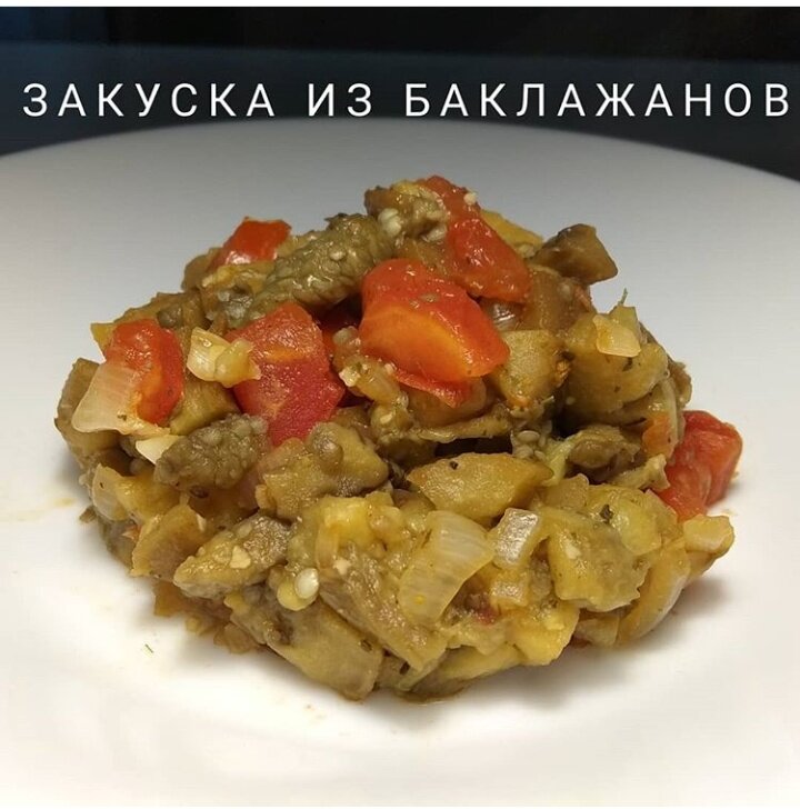 Моем баклажаны, делаем проколы зубочисткой и ставим запекаться в духовке 40 минут. Достаем и пока они остывают, режем лук и обжариваем его до золотистого цвета режем мелко чеснок, помидор и добавляем к луку. Тушим 10 мин периодически помешивая. Тем временем чистим баклажаны от кожуры, нарезаем и добавляем остальные ингредиенты, тушим еще минут 5. Готово. Приятного аппетита