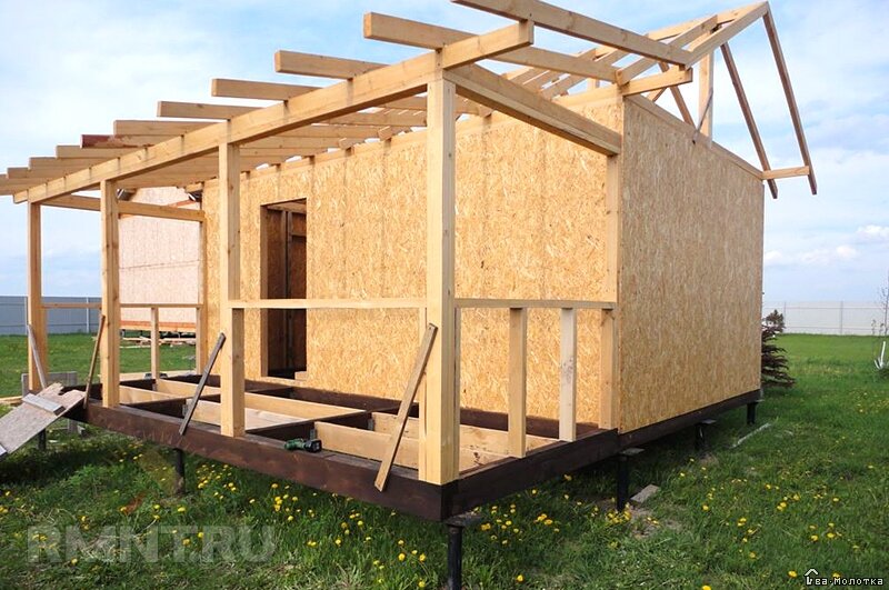 Следующий этап — монтаж обшивки. Снаружи набивается влагостойкая фанера или плиты OSB. Наружную облицовку стен можно выполнить при помощи штукатурки: вначале поверх стен набиваются косо располагаемые колотые доски, поверх которых таким же образом крепится штукатурная дрань. Штукатурка не только дополнительно утеплит стены, но также сделает их пожаробезопасными. Другой способ отделки наружной поверхности стен выполняется с помощью металлических профлистов, но вначале в местах расположения стоек набиваются брусья сечением 50x50 мм, а между ними укладывается звукоизоляция, которая также является и утеплителем.