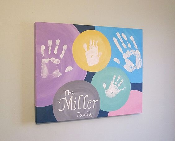 Обычно родители хранят на память слепки ладошек и стоп новорожденных детей. А попробуйте развить эту идею и сохранить отпечатки ладошек всех членов семьи! Дети и родители могут каждый год делать новые отпечатки - будет видно, как растут ладони детей. А можно и раз в несколько лет менять инсталляцию, если хотите.