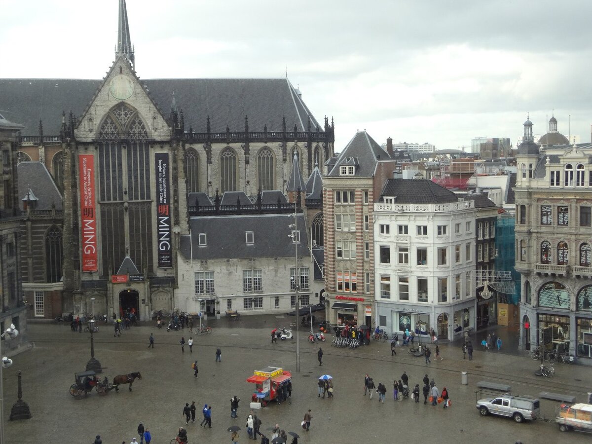 Справа от дворца находится большая церковь XV века, которая называется почему - то Новой церковью. Наверное, где - то тут была и Старая церковь. Но религиозные функции эта церковь выполняет слабо - в те дни в ней проходила выставка китайской династии Мин. А слева от дворца на центральной площади Дам находится знаменитый музей мадам Тюссо. Всего 12 евро - и вы можете пообщаться с известными персонажами. При входе вас встречает королевская чета - принц, простите уже король Виллем - Александр с супругой.