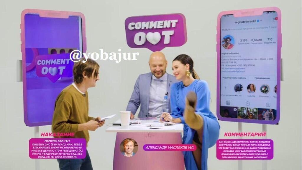 Известная украинская ведущая и блогер Регина Тодоренко во время шоу Comment Out высоко задрала ногу и продемонстрировала прямо в камеру интимное место. Видео без цензуры доступно на Ютуб-канале программы, сообщает UAportal. Участниками шоу были известный музыкант Илья Прусикин и Тодоренко. Читайте также: "Гормоны!" Секс-прелюдия Регины Тодоренко и Влада Топалова попала на видео Во время выполнения одного из заданий Тодоренко предложила Прусикину сделать ей педикюр, подняла ногу и положила её на стол, во время чего всем зрителям и оператору продемонстрировала, что у неё между ног. Скрин с видео опубликовал телеграм-канал Yobajur. Видео инцидента смотрите с 41-й минуты: Ранее Настя Каменских случайно засветила на видео интимное место.