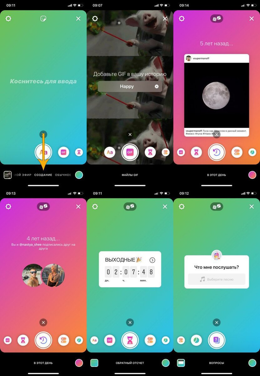 Инстаграм обновил «Истории» и добавил новые возможности. В «историях» появился новый режим «Создание». Главная особенности этого режима в том, что теперь необязательно загружать фото или видео, чтобы опубликовать «историю». Какие появились возможности в новом режиме? 1. GIF-анимация на фон. Возможность выбрать GIF-ку по ключевому слову, она автоматически займет площадь всего экрана. Затем вы можете наложить поверх любой стикер или текст. Выглядит это прикольно! 2. Воспоминания. Возможность выбрать и опубликовать пост, который вы сделали в этот день несколько лет назад (от года). Возможность вспомнить и опубликовать воспоминание о том, с кем вы подписались друг на друга в этот день несколько лет назад. Менять воспоминания можно нажимая на иконку «игральных костей», она находится сверху по центру. 3. Виджеты. Теперь необязательно накладывать какое-либо свое фото или видео, чтобы опубликовать виджет, например «Вопросы» или Обратный «отсчет». Выбирая виджет в режиме «Создания»