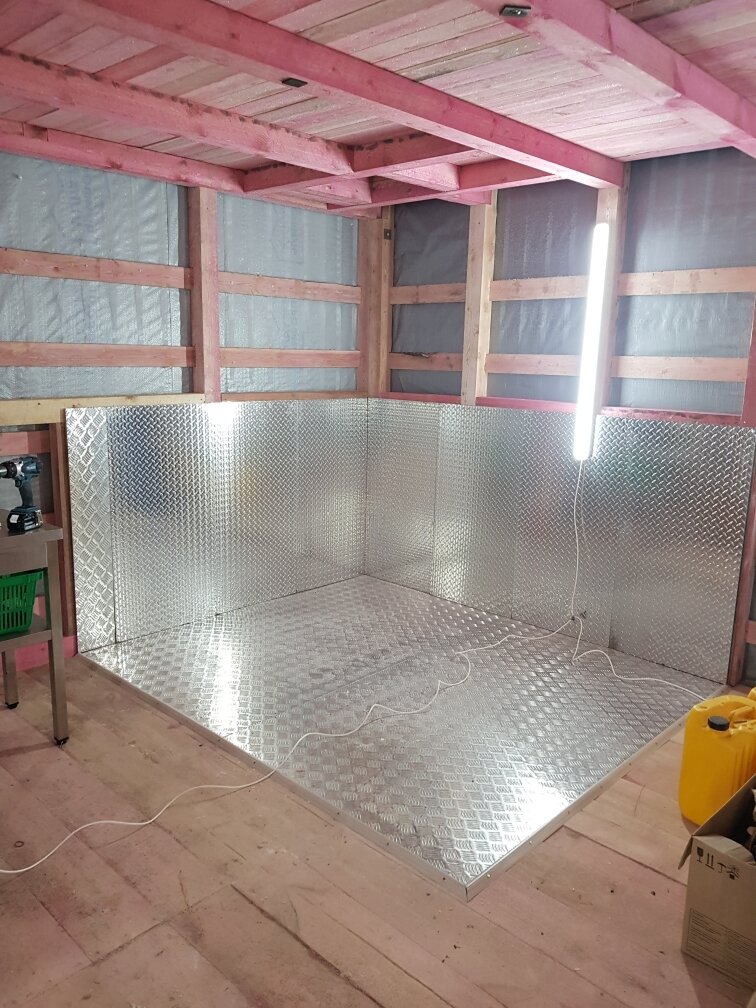 Продолжаю свой рассказ. Сегодня речь пойдет о установке печи для отопления гаража и дымохода. Т.к. стены и крышу поставили в конце февраля, то для продолжения строительства стал вопрос о отоплении гаража. Сначала сделали экран для печи. под экран положили листы огнеупорные, на них уже прикрепили алюминия. Выбор пал на печь "Профессор Бутаков". Рассчитанная на 250 кубов. выбирали по отзывам, да и у людей видел её в работе. очень быстрый прогрев помещения (15-20 минут). И удобство в обслуживании. Единственно, что её немного доработали. Внутри поставили дополнительные экраны, для защиты конвекционных труб. В потолке заранее было установлено технологическое отверстие для дымохода. Переход между вторым этажом. Дымоход рассчитан под печь. высота 4,5 метра, что соответствует паспортным данным самой печи. Поставили вращающийся вентилятор. Обогрев увеличился на 10-15 минут. гараж стал быстрее прогреваться. Запустили печь. Все получилось, как и предполагали. Гараж прогрелся за 15 мин на 20 г