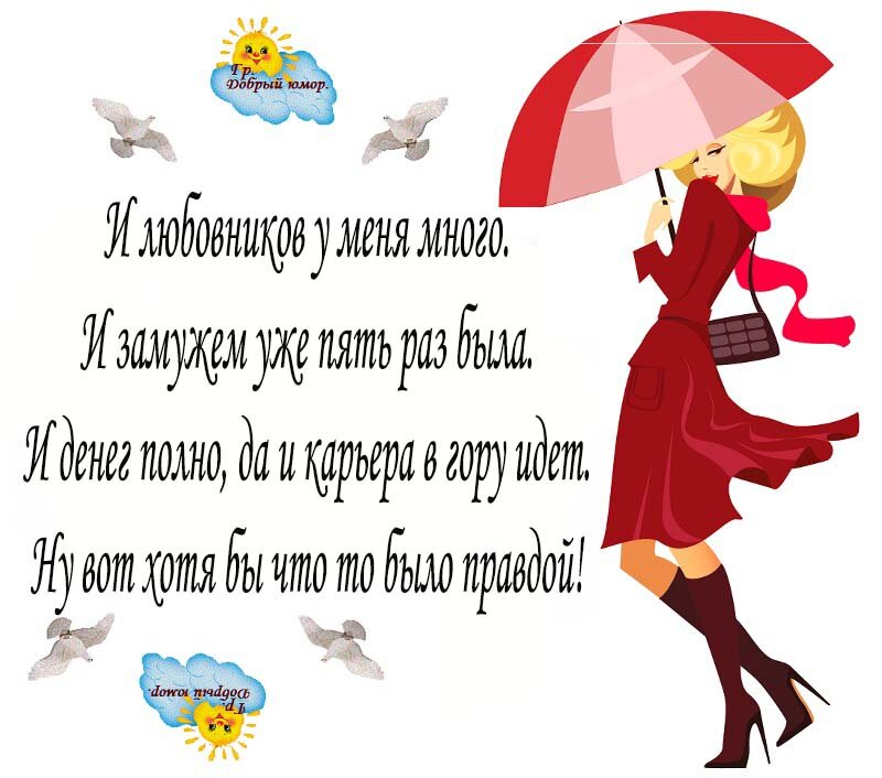 * * * Муж читает, какую то книгу: – «Руки медленно от груди переходят на плечи, далее вниз по позвоночнику скользят по спине к бедрам, плавно переходят на живот...» Жена спрашивает: – Милый, это что, Камасутра? – Нет, инструкция по таможенному досмотру. * * * * * * Одна женщина советует другой: – Ты не переживай, что твой муж волочится за каждой юбкой. Мой пес гоняется за каждой автомашиной, но если он ее догоняет, то потом все равно не знает, что с ней делать! * * * Жена возвращается домой в плохом настроении. Муж спрашивает: – Что с тобой, чем ты расстроена? – Нет, это просто ужасно! – восклицает она. – Когда я хожу по магазинам, чтобы купить подарок на твой день рождения, мне попадаются на глаза вещи, подходящие только мне! * * * У одной матери было десять детей, и при этом все они были мальчиками. И звали их всех Сашами. – Скажите, – спросили ее, – а как вы различаете их? – По отчеству, – ответила гордо женщина. * * * Жена как то купила в магазине ливерную колбасу. – Зачем ты