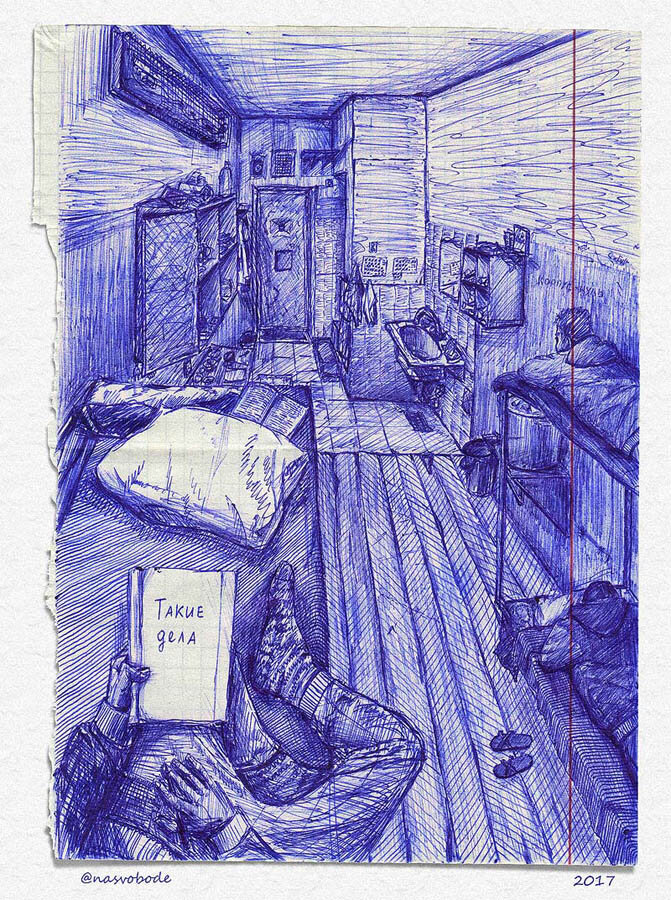 Еще в мыслях о тюрьме я рисую, учусь фантазировать, вспоминаю кадры со свободы. Последние месяцы стараюсь тщательно запомнить окружающий мир, его цвета, вкусы, запахи, то, каков он на ощупь. Часто смотрю на вещь, пейзаж, человека, и в голове у меня отражается рисунок шариковой ручкой на тетрадном листе.