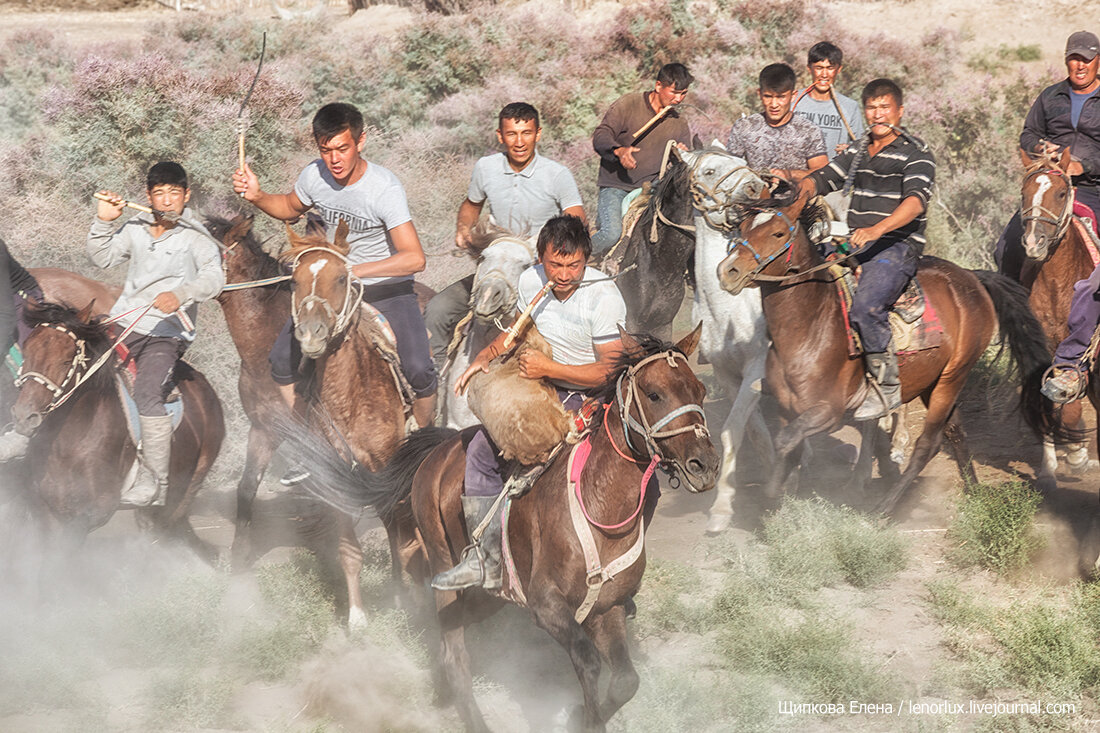 Я много слышала об этой игре, а впервые увидела в Каракалпакии, в Топе ауле, когда к вечеру все мужское население пересело на коней, а все зрители и болельщики собрались на специальном поле, где и проводятся соревнования.