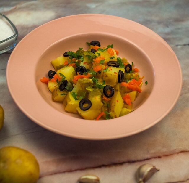 Привет! Друзья сегодня приготовим теплый салат с интригующей остринкой, которым можно удивить и приятно порадовать гостей и домашних. Готовится теплый картофельный салат быстро, а получается он сытным и вкусным. Для салата нам понадобится: Оливковое масло - 4 ст. ложки, Картофель - 1,5 кг. Консервированный перец (можно купить в перекрестке) - 110 гр. Чеснок - 3 зубчика, Хлобья Чили - 3 чайные ложки, Маслины - 50 гр. Соль (по вкусу) Петрушка - 1 пучок. Подготовьте ингредиенты, помйте картофель. Картофель нарежьте крупными кубиками, сварите до мягкости в кипящей подсоленной воде, остудите.