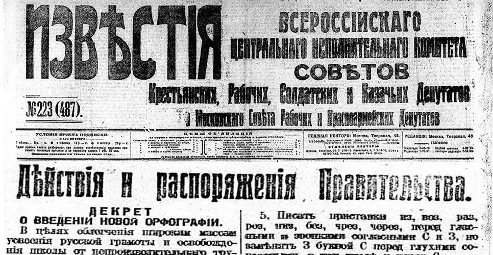 10 октября 1918 года был принят декрет Совета народных комиссаров и постановление президиума Высшего совета народного хозяйства «Об изъятии из обращения общих букв русского языка» (i десятеричное, фита и ять).