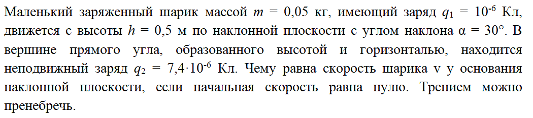 Полное условие задачи Краткое условие задачи Решение задачи Решим задачу, применив закон сохранения энергии. В начальный момент полная энергия шарика складывается из потенциальной энергии в поле притяжения Земли и потенциальной энергии заряда шарика в электрическом поле, создаваемом неподвижным зарядом: где: Потенциал электрического поля неподвижного заряда в месте начального расположения шарика равен: С учетом выражений (2), (3) и (4) перепишем выражение (1): Полная энергия шарика в момент нахождения у основания наклонной плоскости состоит из кинетической энергии движения шарика и потенциальной энергии заряда шарика в электрическом поле неподвижного заряда: где, Потенциал электрического поля неподвижного заряда у основания наклонной плоскости: Из рисунка видно, что длина основания наклонной плоскости равна: Тогда: С учетом выражений (6), (7) и (8) перепишем выражение (5): Из закона сохранения энергии следует, что: или: Отсюда ищем скорость: Подставляем данные и находим численный отве