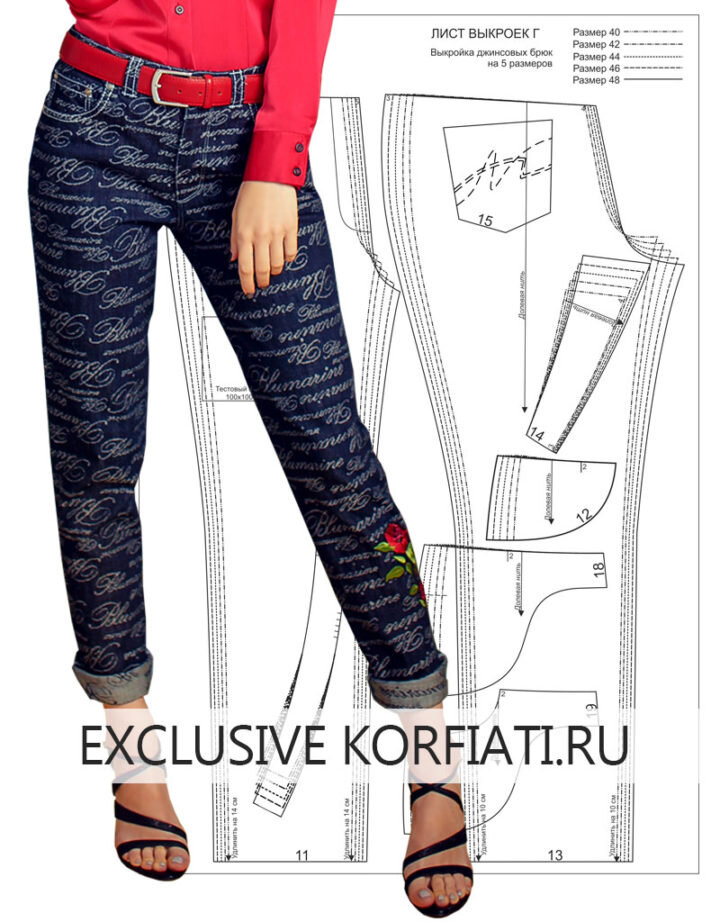 Джинсовые брюки давно стали универсальной одеждой, и прочно заняли свое достойное место не только в мужском, но и в женском гардеробе. Крой джинсовых брюк отличается от классических тем, что у них более плотная облегающая посадка по фигуре, но, несмотря на это, современные джинсовые ткани позволяют создавать очень комфортные изделия, ведь даже узкие модели из плотного денима со временем способны принимать форму тела. В наших предыдущих уроках мы уже давали вам подробное построение базовой выкройки джинсовых брюк. А сегодня предлагаем готовую выкройку джинсовых брюк на 5 стандартных размеров, которую вы можете скачать абсолютно бесплатно. Выкройка в натуральную величину дана на пять стандартных размеров (с 40-го по 48-й), в двух форматах — полном и разбитом на листы А4. Скачайте pdf-файл на ваш компьютер в любом из удобных форматов и распечатайте. Выкройку в полном формате можно распечатать в любом копи-центре, а выкройку на листах А4 вы сможете распечатать на вашем принтере и склеить