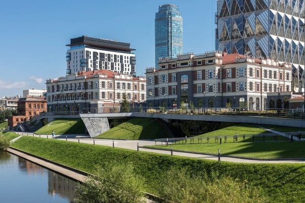 Еще одним интересным представителем элит-класса в Екатеринбурге является жилой дом «Кандинский», расположенный в исторической части города, на набережной реки Исеть. Фасад дома разработан архитекторами бюро Aedas. Разные фактуры облицовочных материалов, характер остекления и цветовые решения делают здание соразмерным и созвучным ритму города.