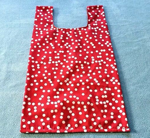 Здравствуйте! Сейчас я хочу показать вам как можно сшить замечательную сумку-маечку за полчаса, которая прослужит намного дольше, чем обыкновенные полиэтиленовые пакеты такого плана. Для начала подберем подходщий по разрмеру пакет-майку и обрежем у него верх ручек и низ рядом с линиями склеивания швов. Затем расправим будущую выкройку: На сложенную пополам ткань накладывем нашу выкройку, расправляем ее и прикалываем булавками к ткани. Отсупив от края примерно 0,5-1 см вырезаем ткань по выкройке. Затем отрезанные детали выкройки из ткани складываем лицевыми сторонами внутрь, выравнивая края. Соединяем детали булавками. Сшиваем на швейной машине боковые стороны сумки, дополнительно обрабатывая края с помощью оверлока или зигзагообразной строчки на обычной машине. Затем обрабатываем на оверлоке боковые и внутренние стороны ручек на каждой детали отдельно. После обработки этих краев делаем подгибы оверложенных частей на изнаночную сторону. И прокладываем прямую строчку. Получается, что в