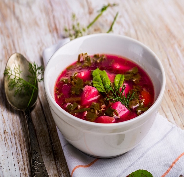 Витаминный борщик, который понравится всем! Очень вкусный, аппетитного бордового цвета. а главное наполненный витаминами. Ингредиенты на 8 порций: Картошка - 300 г Лук репчатый - 1 шт Морковь - 1 шт Свекла - 2 шт Растительное масло - 4 ст. ложки Соль - по вкусу Томатный соус - 4 ст. ложки Уксус - 1 ст. ложка Свекольная ботва - 500 г Пошаговое приготовление: 1. Продукты которые нам понадобятся для приготовления борща со свекольной ботвой. Овощи нужно брать только молодого урожая. 2. Молодой картофель, чистим, моем, режим небольшими кусочками складываем в кастрюлю и заливаем водой, примерно 2.5 литра, ставим на огонь. Добавляем соль по вкусу. 3. Репчатый лук мелко крошим, морковку трем на крупной терке. 4. Морковку и лук тушим на сковороде с растительным маслом и томатным соусом ( можно использовать помидоры), 10 минут, в кипящий борщ высыпаем тушенные овощи. 5. Свеклу чистим и трем на крупной терке. 6. У листьев свеклы отрезаем черешки и режим кусочками, примерно, по 1 см. Складыв
