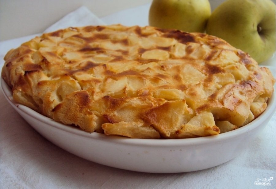 Форму для запекания смазать растительным маслом и равномерно распределить творожную массу. Поверх выложить яблоки. Отправить пирог в разогретую духовку на 25-30 минут до румяного цвета. Температурный режим 180-200 градусов. Готовую выпечку немного остудить и можно подавать к чаю.